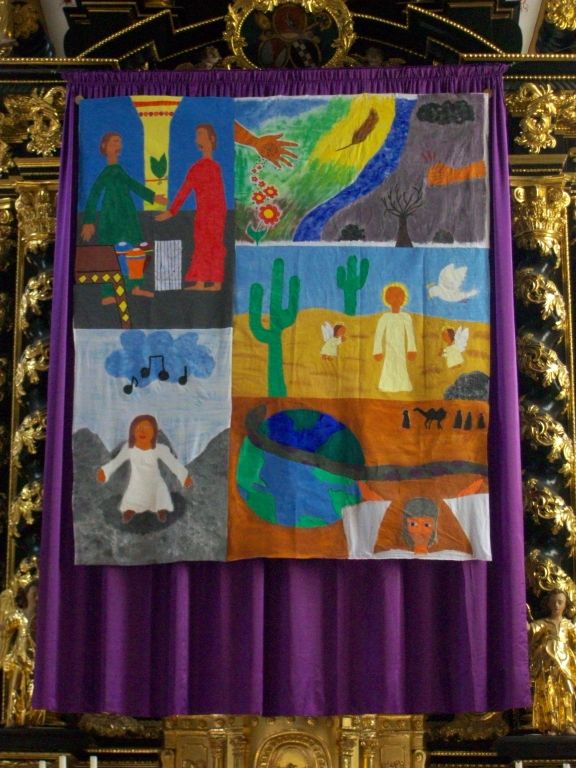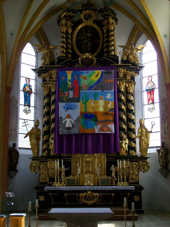 | Dieses Jahr wurde das Hungertuch, zum Verhüllen des Hauptaltars während der Fastenzeit, wieder durch die einzelnen Gruppen gemalt. | ||